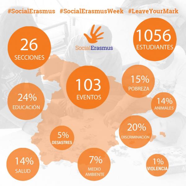 En España concretamente fueron 26 las secciones que participaron realizando algún tipo de actividad, de 35 que hay en todo el país. Entre todas se consiguió mover aproximadamente a unos 1000 estudiantes que realizaron actividades de todo tipo: asistir a refugios de animales, donación de sangre, donación de alimentos, visitas a hospitales infantiles o residencias de ancianos… También tenemos las actividades que se hicieron en los colegios o institutos con el objetivo de acercar a los niños las diferentes culturas o idiomas a través de los estudiantes internacionales que residen en sus ciudades. Estas actividades forman parte del marco Erasmus in Schools (EiS). Y por último se llevaron a cabo actividades de concienciación sobre las diferentes discapacidades como: talleres de lengua de signos, cenas a ciegas, baloncesto en silla de ruedas, desarrollo de sentidos…